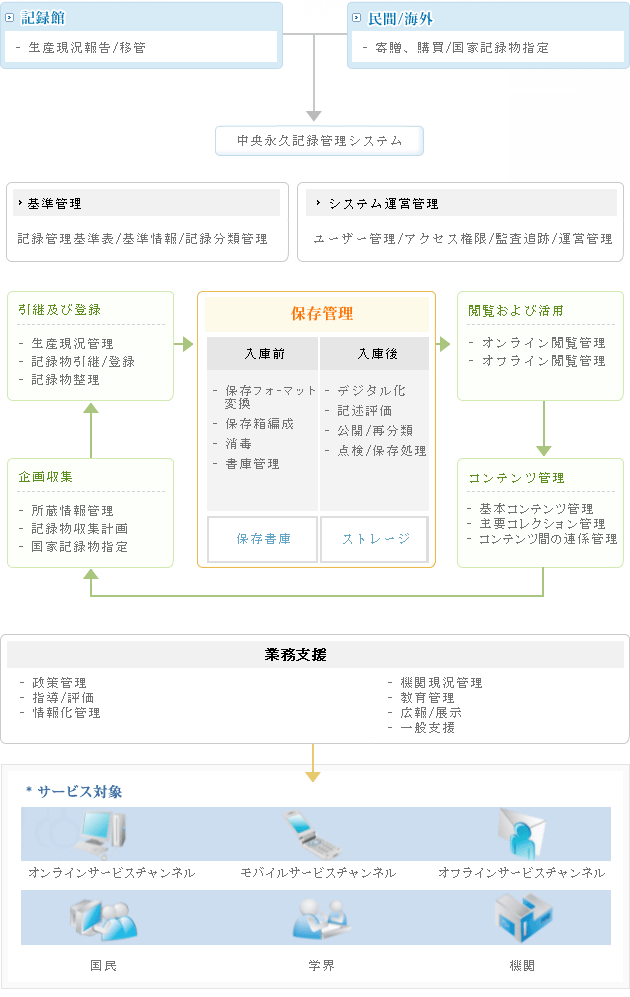引継/登録、保存管理、閲覧活用、コンテンツ管理などから構成され、今後、永久記録物の