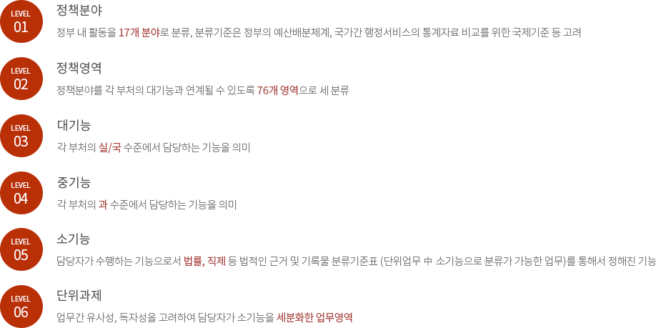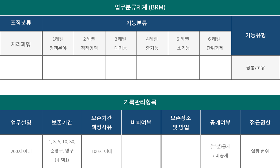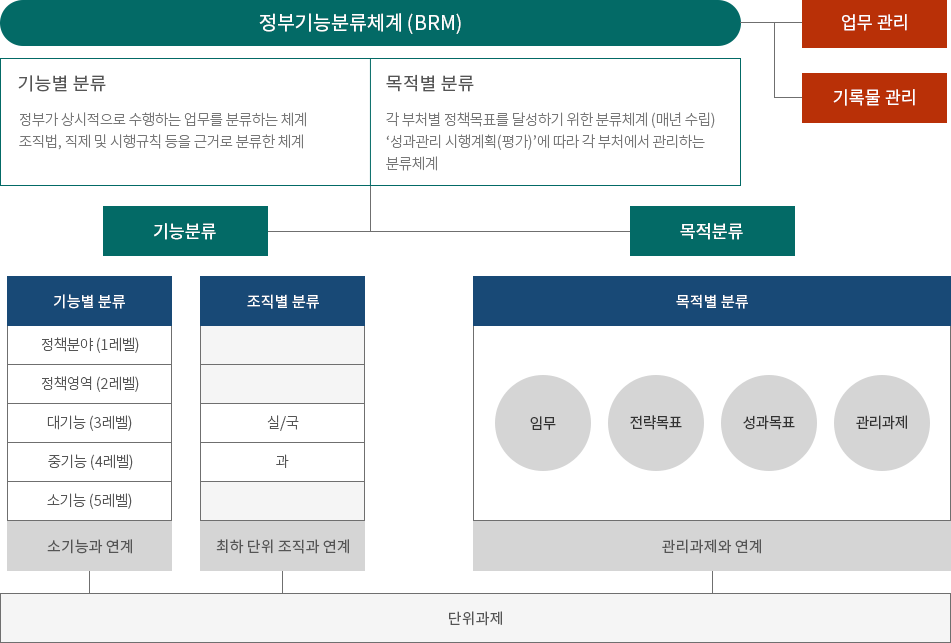 업무과정에 기반한 기록관리 체계를 구축하기 위해 정부기능분류체계(BRM : Business Reference Model)를 기록물 분류체계로 도입