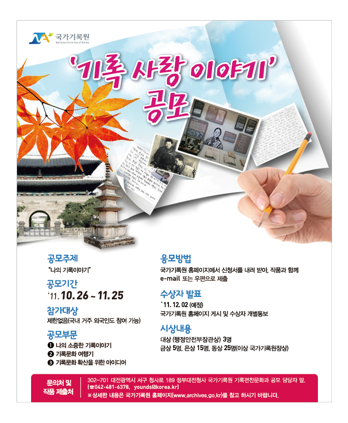 국가기록원에서는 기록 및 기록관리의 중요성에 대한 인식을 제고하는 계기를 마련하고, 국민 친화적인 기록문화의 확산을 도모하기 위하여 「기록 사랑 이야기」를 아래와 같이 공모합니다.o 공모 주제 : 나의 기록 이야기o 공모 기간 : 2011. 10. 26 ~ 11. 25 (1개월간)o 공모 부문 : 나의 소중한 기록 이야기 등붙임 「기록 사랑 이야기」 공모 안내문 및 포스터를 참조하십시요.