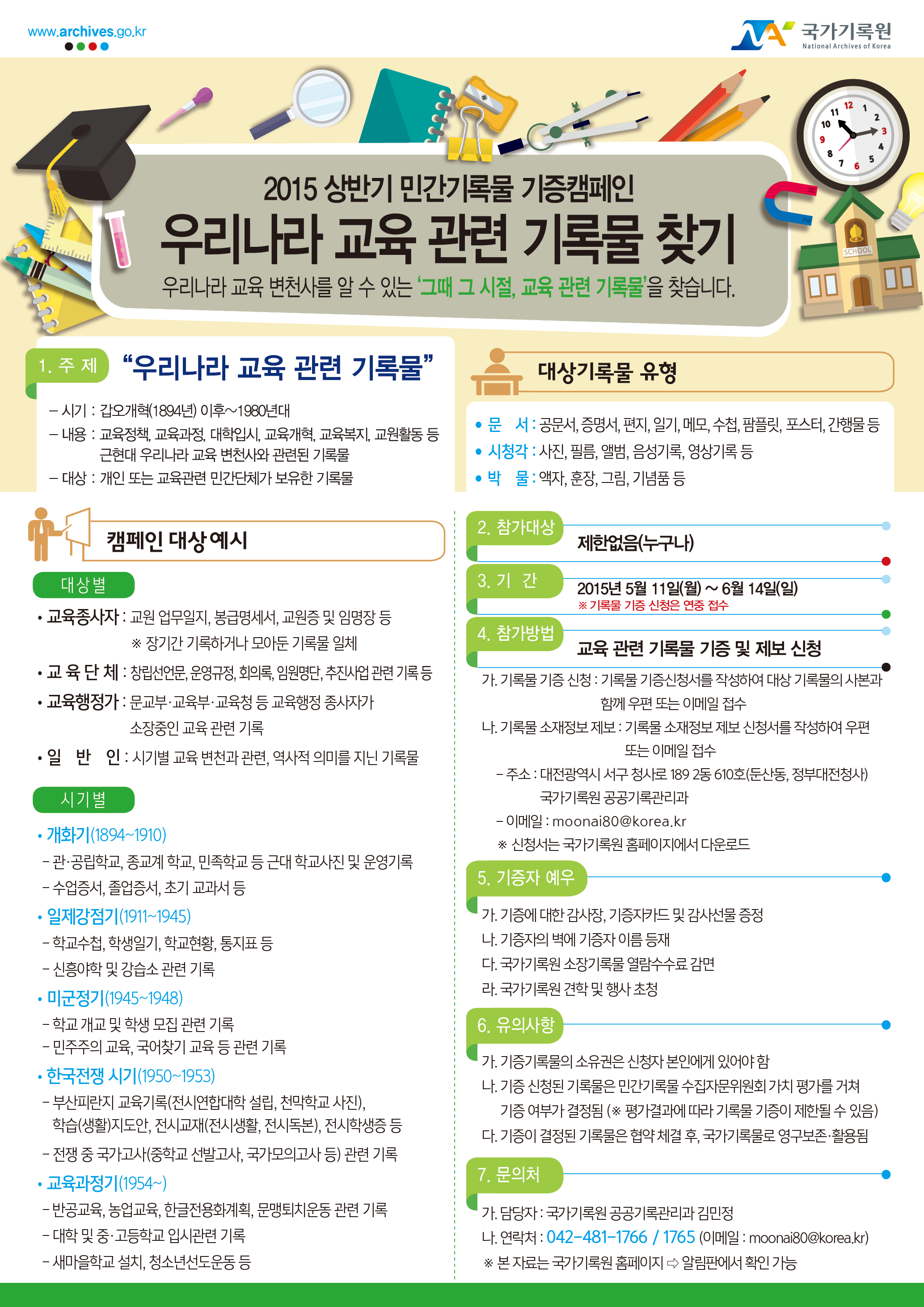 <시기별> ○ 개화기(1894~1910) - 관·공립학교, 종교계 학교, 민족학교 등 근대 학교사진 및 운영기록 - 수업증서, 졸업증서, 초기 교과서 등 ○ 일제강점기(1911~1945) - 학교수첩, 학생일기, 학교현황, 통지표 등 - 신흥야학 및 강습소 관련 기록 ○ 미군정기(1945~1948) - 학교 개교 및 학생 모집 관련 기록 - 민주주의 교육, 국어찾기 교육 등 관련 기록 ○ 한국전쟁 시기(1950~1953) - 부산피란지 교육기록(전시연합대학 설립, 천막학교 사진), 학습(생활)지도안, 전시교재(전시생활, 전시독본), 전시학생증 등 - 전쟁 중 국가고사(중학교 선발고사, 국가모의고사 등) 관련 기록 ○ 교육과정기(1954~) - 반공교육, 농업교육, 한글전용화계획, 문맹퇴치운동 관련 기록 - 대학 및 중·고등학교 입시관련 기록 - 새마을학교 설치, 청소년선도운동 등 대상기록물 유형 ○ 문 서 : 공문서, 증명서, 편지, 일기, 메모, 수첩, 팜플릿, 포스터, 간행물 등 ○ 시청각 : 사진, 필름, 앨범, 음성기록, 영상기록 등 ○ 박 물 : 액자, 훈장, 그림, 기념품 등 2. 참가대상 : 제한 없음(누구나) 3. 기간 : 2015년 5월 11일(월) ~ 6월 14일(일) ※ 기록물 기증 신청은 연중 접수 4. 참가방법 : 교육 관련 기록물 기증 및 제보 신청 가. 기록물 기증 신청 : 기록물 기증신청서를 작성하여 대상 기록물의 사본과 함께 우편 또는 이메일 접수 나. 기록물 소재정보 제보 : 기록물 소재정보 제보 신청서를 작성하여 우편 또는 이메일 접수 - 주소 : 대전광역시 서구 청사로 189 2동 610호(둔산동, 정부대전청사) 국가기록원 공공기록관리과 - 이메일 : moonai80@korea.kr ※ 신청서는 국가기록원 홈페이지에서 다운로드 5. 기증자 예우 가. 기증에 대한 감사장, 기증자카드 및 감사선물 증정 나. 기증자의 벽에 기증자 이름 등재 다. 국가기록원 소장기록물 열람수수료 감면 라. 국가기록원 견학 및 행사 초청 6. 유의사항 가. 기증기록물의 소유권은 신청자 본인에게 있어야 함 나. 기증 신청된 기록물은 민간기록물 수집자문회의 가치 평가를 거쳐 기증 여부가 결정됨 ※ 평가결과에 따라 기록물 기증이 제한될 수 있음 다. 기증이 결정된 기록물은 협약 체결 후, 국가기록물로 영구보존·활용됨 7. 문의처 가. 담당자 : 국가기록원 공공기록관리과 김민정 나. 연락처 - 전화 : 042-481-1766/1765 - E-mail : moonai80@korea.kr |