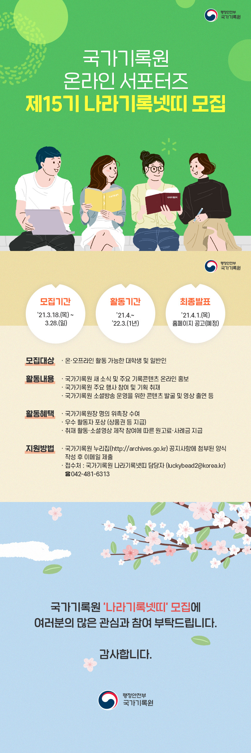기록과 온라인 홍보 활동에 관심 있는 여러분의 많은 참여 부탁드립니다. 2021년 3월 18일 국가기록원장