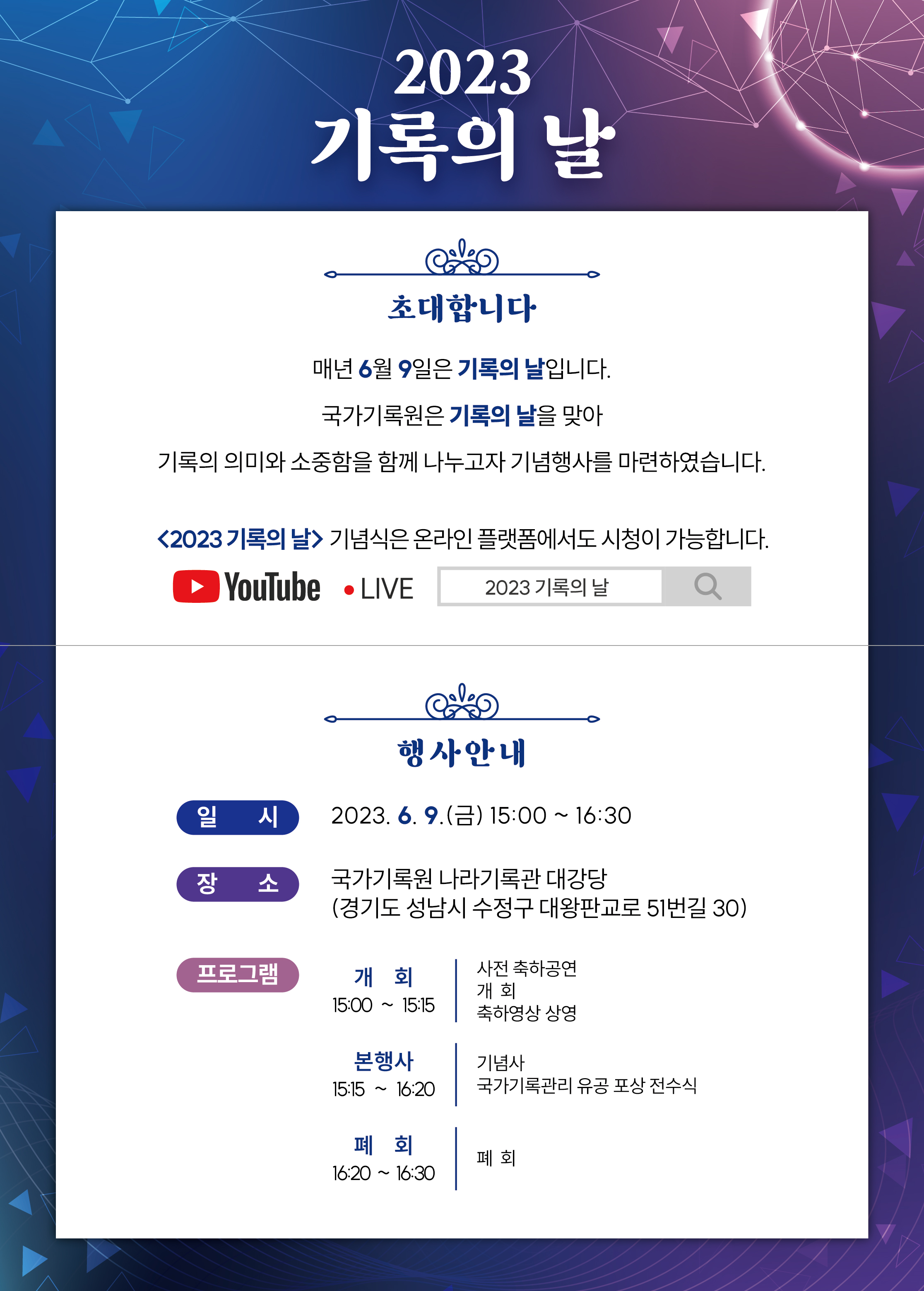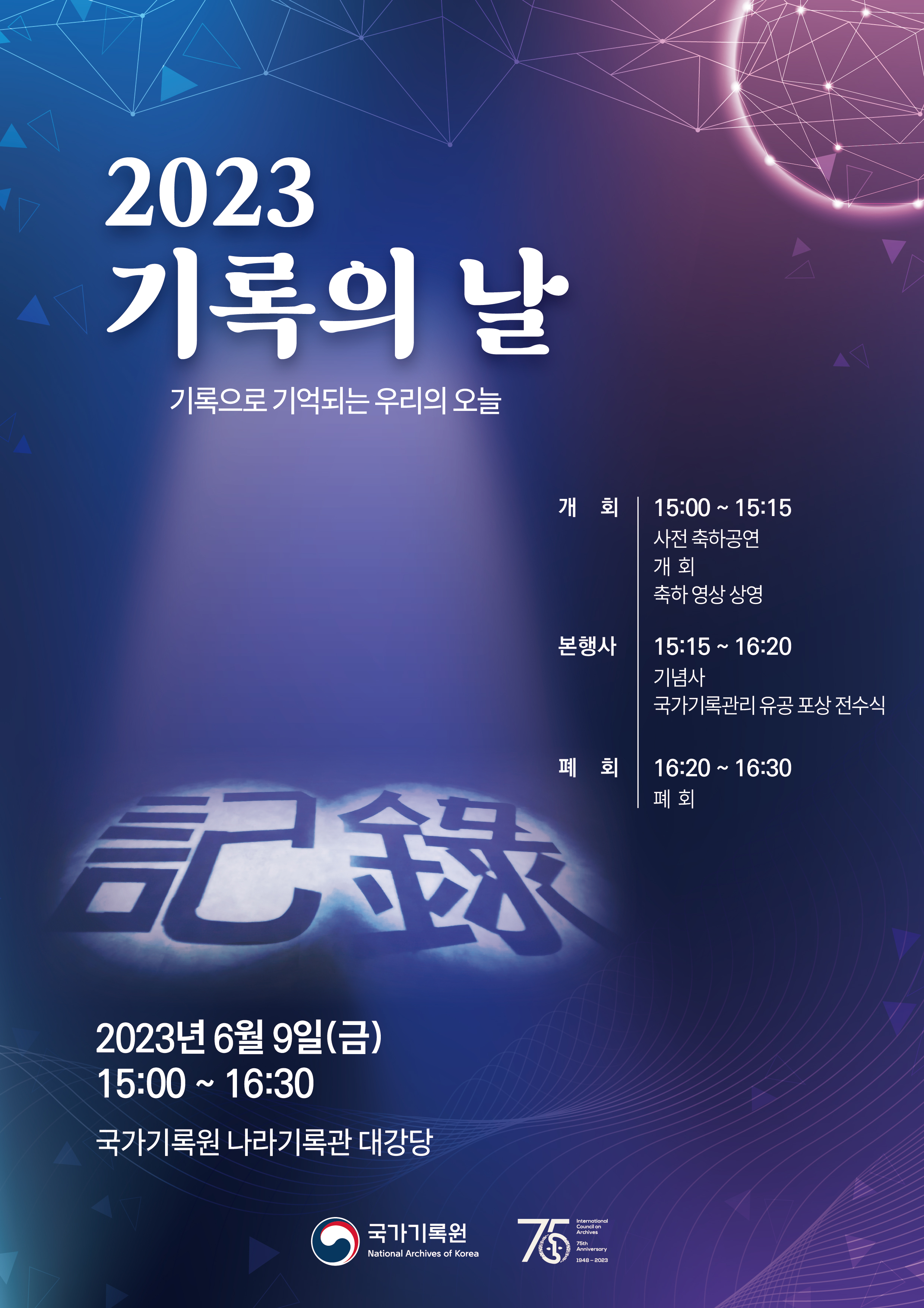 * 2023 기록의 날 검색・︎참여 ※ 궁금한 사항이 있으시면 국가기록원 기록협력과(042-481-6239)로 문의하여 주시기 바랍니다. |