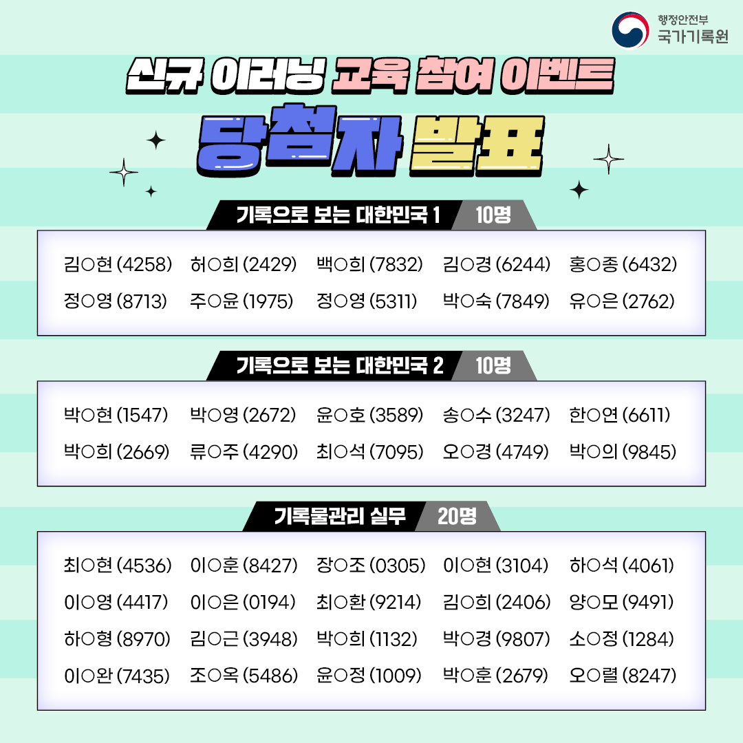 과정 수료하신 분 들 중 추첨된 40분의 명단을 붙임과 같이 알려드립니다. (당첨자 개별 문자 발송) 앞으로도 국가기록원 기록관리교육에 많은 관심 부탁드립니다. 감사합니다. |