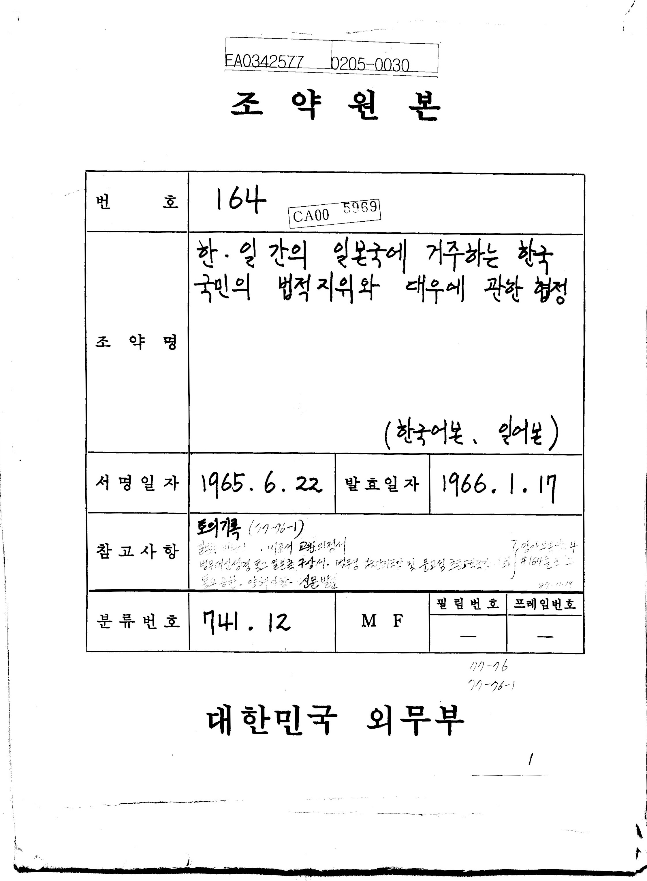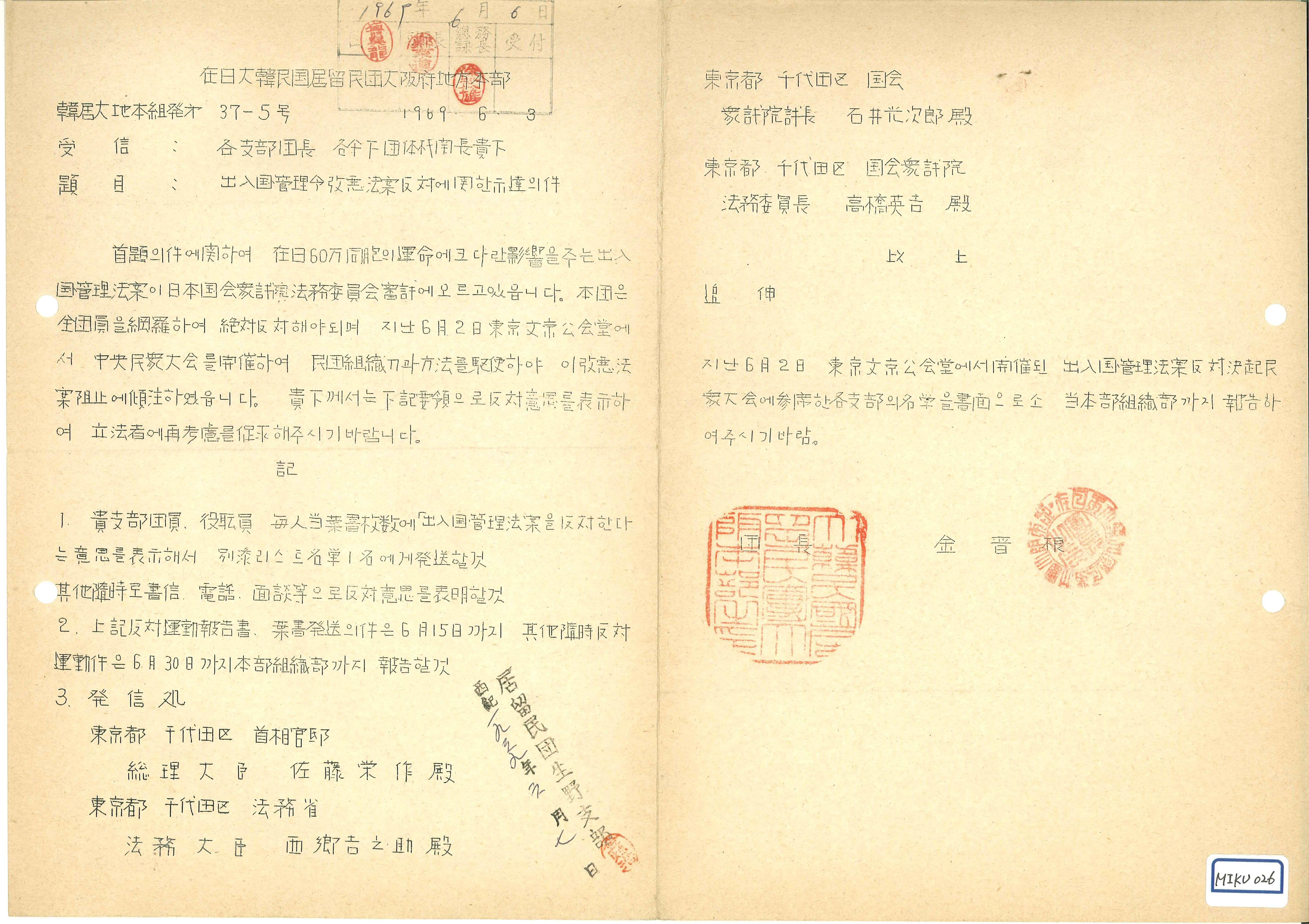 한‧일간의 일본국에 거주하는 한국국민의 법적지위와 대우에 관한 협정 (한국어본, 일어본) (CA0005969) | [출입국법안]의 문제점 (DTA0020885) | 출입국관리령개악법안반대에관한시달의건 (BTA0001727) |