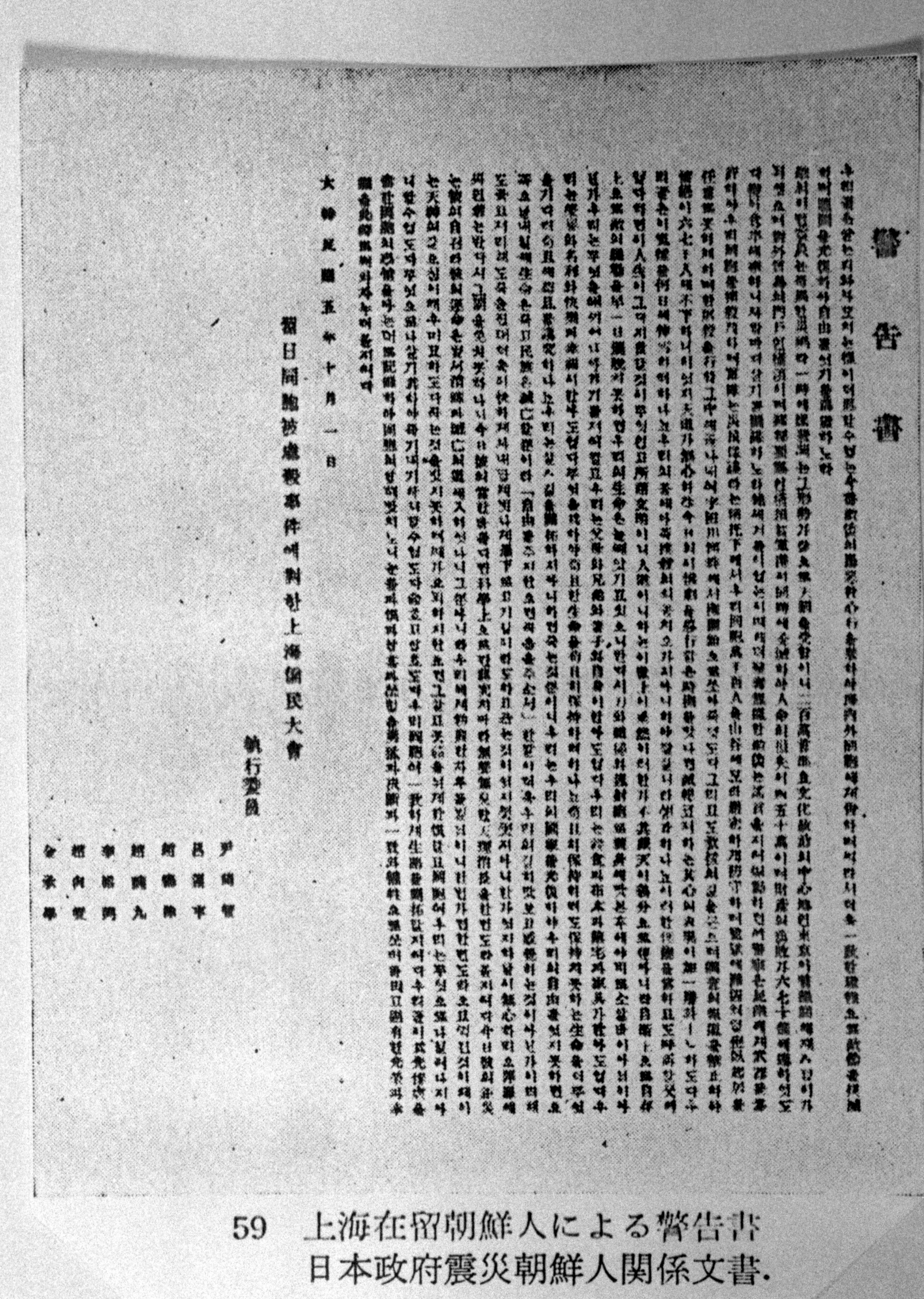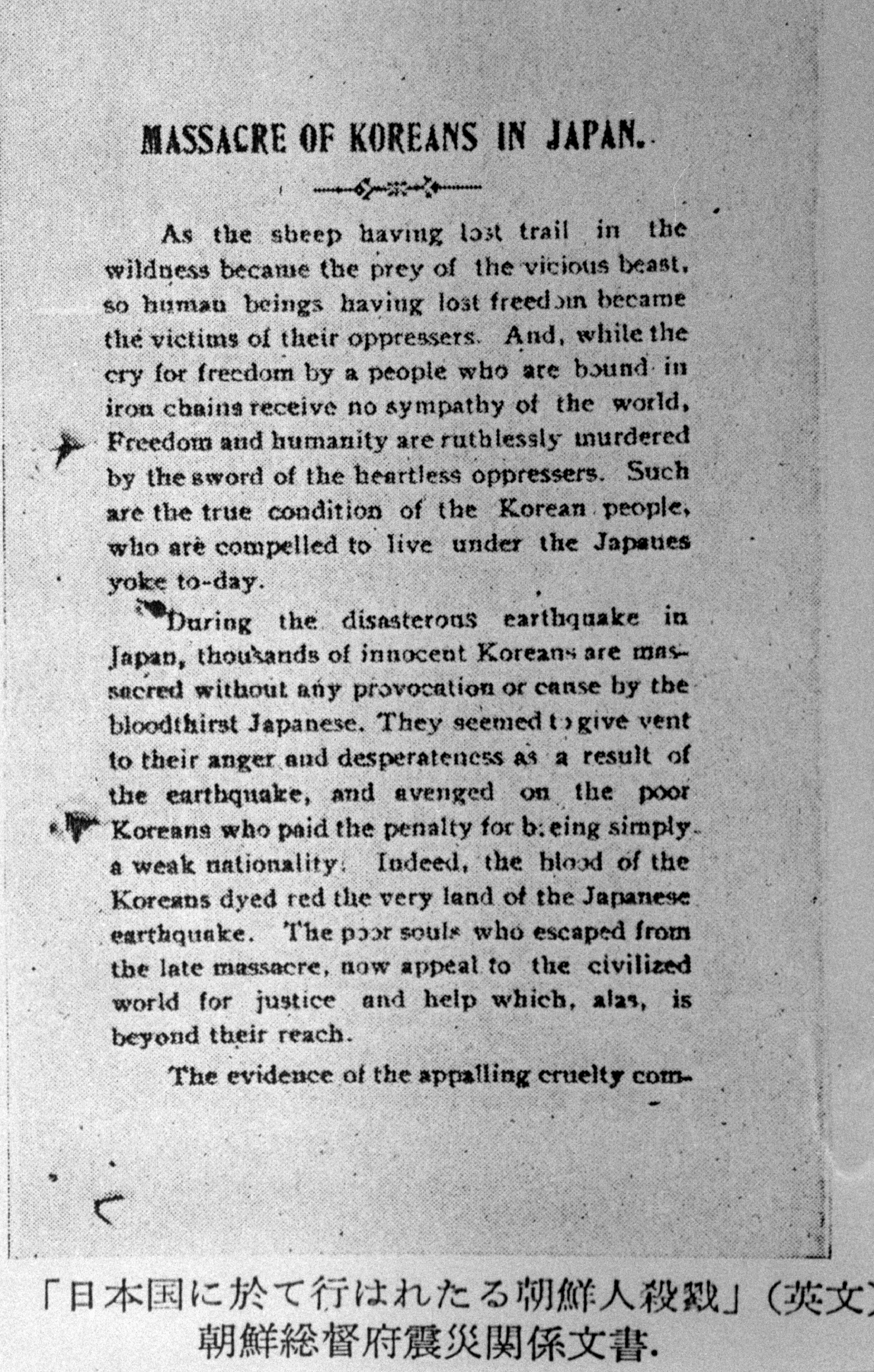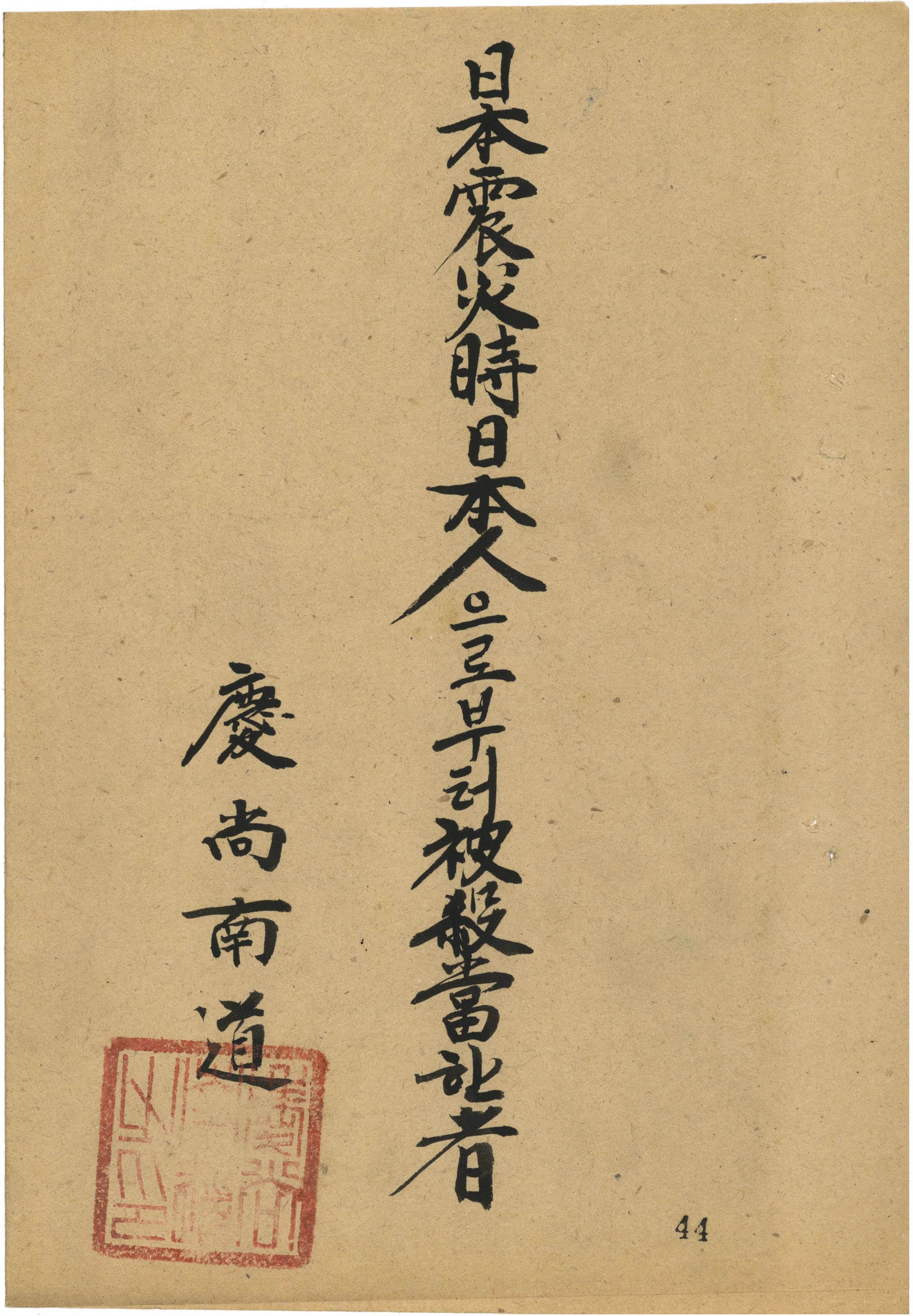 ¶ 관동 대지진 당시 조선인 학살 사건은 1923년 9월 2일부터 6일까지 일본 관동지방에서 군과 경찰, 그리고 무장한 민간인들에 의해 조선인들이 집단적으로 살해된 사건이다. 9월 1일 발생한 대지진으로 사회 전반이 큰 혼란에 빠진 가운데, 일본 내무성은 계엄령을 선포하고 각 경찰서에 “조선인들이 방화, 폭탄 테러, 강도를 계획하고 있으니 주의하라”는 지시를 내렸다. 이 지시는 사실 확인 없이 신문에 그대로 보도되었고(DA0587203), 이후 과장되거나 근거 없는 내용이 더해지면서 유언비어가 급속히 확산되었다. 그 결과 “조선인들이 우물에 독을 풀었다”, “조선인들이 폭탄을 가지고 다닌다”와 같은 터무니없는 소문이 퍼졌다. 이러한 유언비어는 사실 여부와 관계없이 불안해진 일본 사회 분위기 속에서 조선인에 대한 적개심을 키웠고, 결국 관동지방 전역에서 무장한 자경단이 조직되어 조선인들을 무차별적으로 색출·살해하는 비극으로 이어졌다. 이 사건으로 희생된 조선인의 정확한 수는 현재까지 확인되지 않는다. 다만 최소 6천 명 이상으로 추정된다. 『독립신문』 1923년 12월 5일자(DTA0018845)는 유언비어에 휩쓸린 자경단에 의한 조직적 학살 실태를 고발하며, 조선인 희생자 수를 6,661명으로 보도하였다. 대한민국 정부는 1952년 이승만 대통령의 지시(BG0000029)에 따라 전국적으로 관동 대지진 희생자 수를 조사·집계하고, 「일본진재시피살자명부」(CA0333224)를 작성하였다.