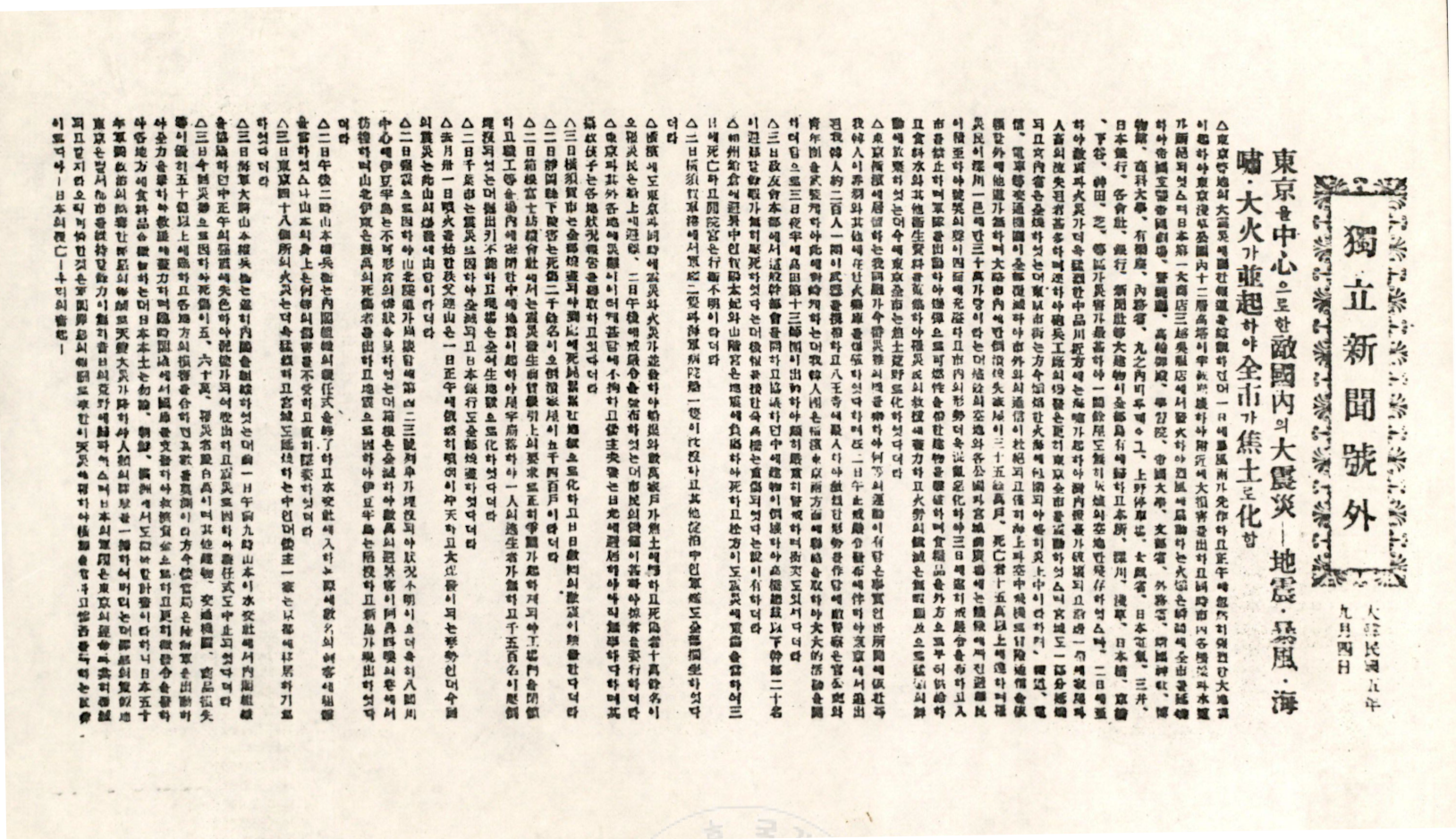 독립신문'1923년 12월 5일 호 게재 김영학 조사 조선인 학살수 정리자료 및 독립신문 (DTA0018845) |