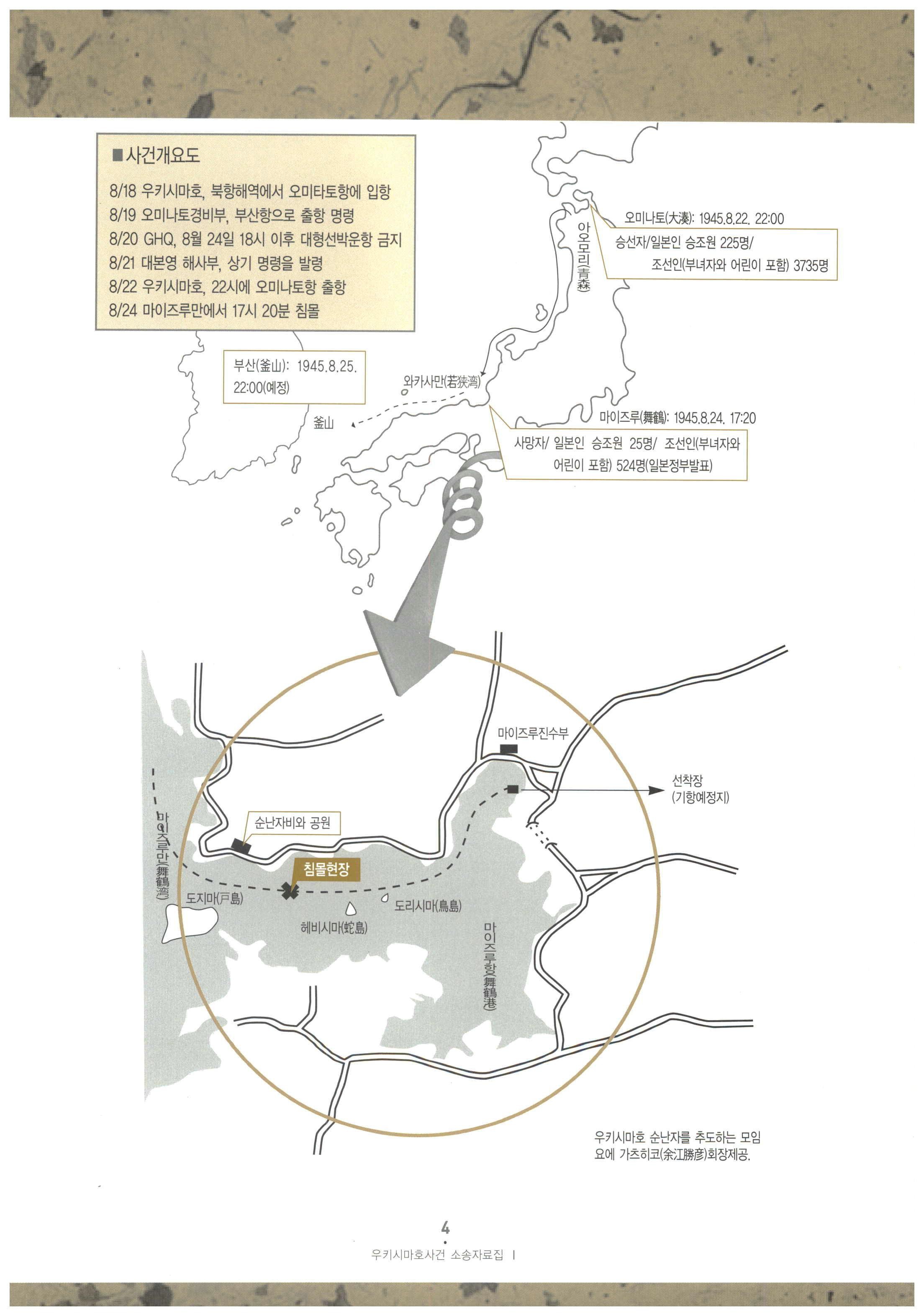 본 가이드에 포함된 기록물은 국가기록원이 소장한 「태평양전쟁 종전 직후 강제동원되었던 조선인의 귀국」 관련 기록물 가운데 재일동포와 직접적인 관련이 있는 자료이다. 이 중 약 76% 이상은 태평양전쟁희생자 광주유족회로부터 수집한 우키시마호 사고 생존자 장영도 씨의 사고 원인 규명 활동 자료와, 일제강점하강제동원피해진상규명위원회가 생산·이관한 우키시마호 사건 진상조사 보고서로 구성되어 있다. 이 밖에도 일본 외무성 외교사료관에서 수집한 「태평양전쟁 종결에 의한 구 일본국적인의 보호·인양 관계 잡건–조선인 관계」 기록 등 다양한 관련 자료가 포함되어 있다. ☞ 기록물 전체목록