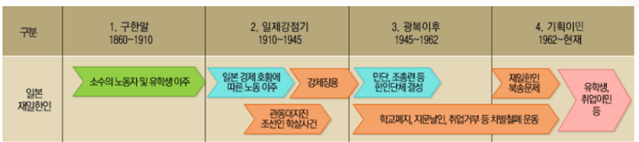¶ 1945년 일본의 패전과 함께 한국이 독립하자, 일본에 거주하던 재일동포 가운데 상당수가 고국으로 귀국하였다. 그러나 귀국 과정에서 반출할 수 있는 재산에 대한 엄격한 규제가 시행되는 등 사유로 일본에 남을 수밖에 없었던 동포도 적지 않았다. 그 결과 일본에 잔류한 재일동포의 수는 약 60만 명에 이르렀다.이들 재일동포는 1947년 5월 일본의 「출입국관리령(영제311호)」이 시행되기 전까지 형식상 일본 국적을 유지하고 있었다. 그러나 출입국관리령이 시행되면서 ‘외국인 등록’ 의무 대상자로 전환되었고, 1952년 4월 28일 샌프란시스코 강화조약이 발효되자 일본 국적을 일괄적으로 상실하게 되었다. 이로써 재일동포는 국적이 없는 외국인이 되었으며, 일본 사회에서의 법적 지위는 크게 약화되었다. 국적을 상실한 재일동포는 참정권을 비롯해 공무원 임용, 공공 분야 직업 선택, 사회복지 등 정치·경제·사회 전반에 걸친 권리를 크게 제한받았다. 또한 법적 지위가 불안정한 상황을 이용한 개별 강제퇴거나 강제송환 사례도 잇따라 발생하였다(DA0095633). 1965년 한일국교정상화와 함께 「한일법적지위협정」(1965.6.22.)이 체결되면서 재일한국인의 법적 지위는 일부 인정되기 시작하였다. 그러나 조총련계 조선적 재일동포의 경우에는 여전히 여러 권리가 제한된 상태로 남아 있었다. 이러한 상황은 1991년 「출입국관리 및 난민인정법」이 개정되면서 일정 부분 개선되었다. 이 개정으로 재일동포에게 ‘특별영주자’ 지위가 부여되었고, 장기 체류권과 재입국의 자유가 보장되었다. 또한 사회보장제도 이용이 확대되고 공무원 임용에 대한 일부 제한이 완화되었으며, 지문 날인 제도도 폐지되는 등 재일동포에 대한 처우는 점차 개선되었다.