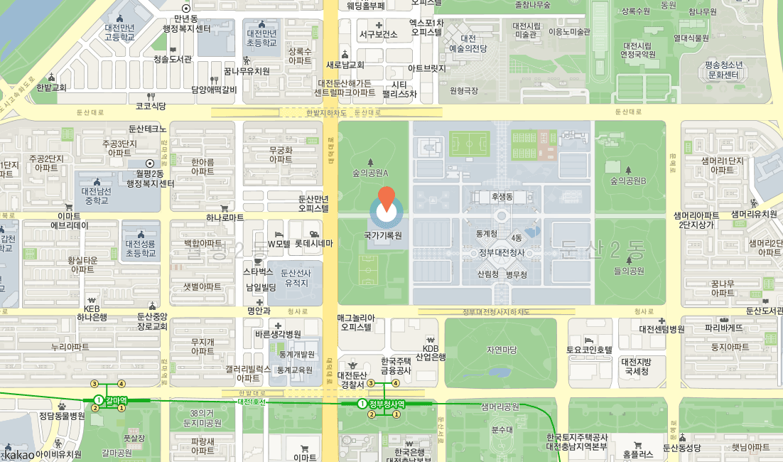 | 서대전 IC 이용시 | 서대전 IC → 직진(진잠타운아파트, 가수원교) → 정림동 방향으로 우회전→고가다리위에서 좌회전 → 직진(배재대학교, 경성큰마을) → 경성큰마을 사거리 직진 → 둔산시외버스정류장 30M지나서 우회전→정부대전청사 도착(동문) |
